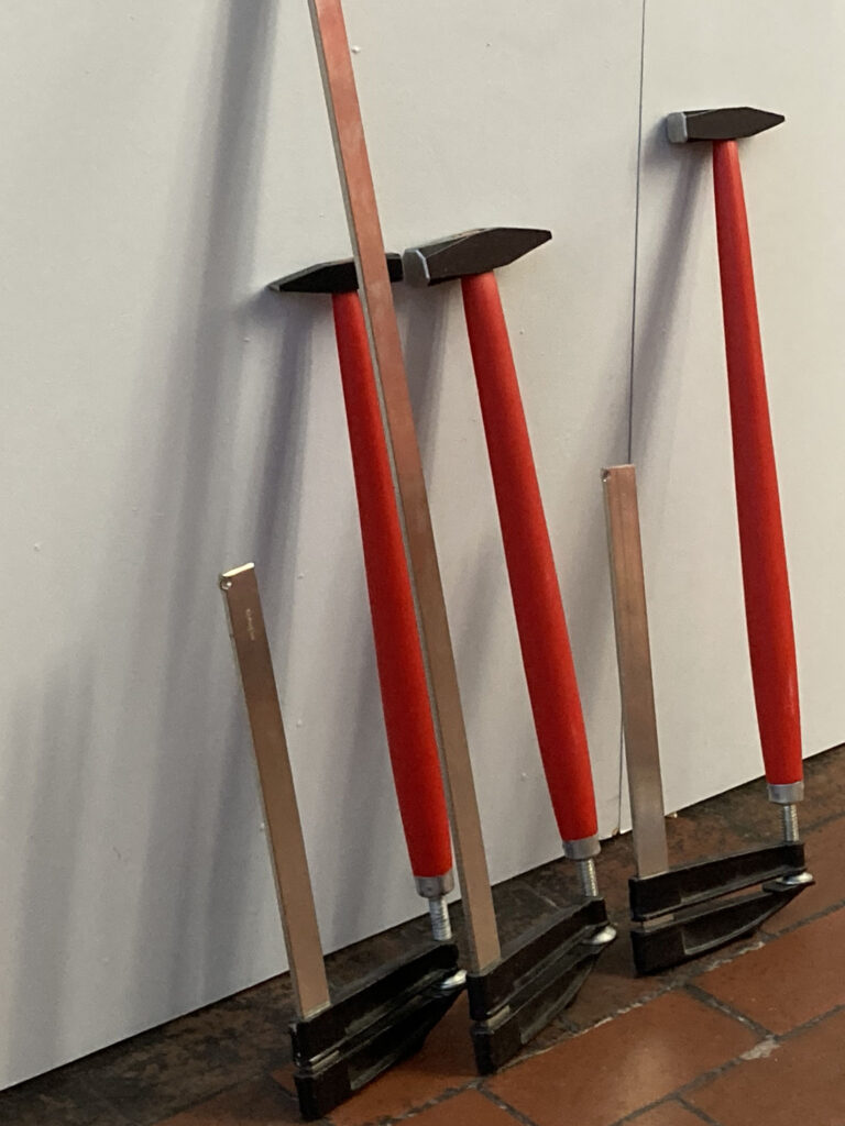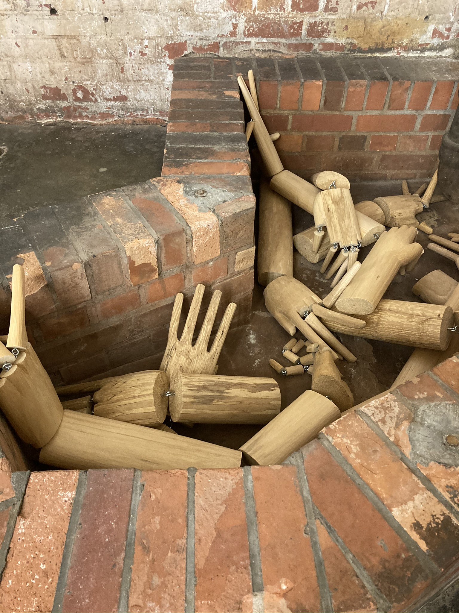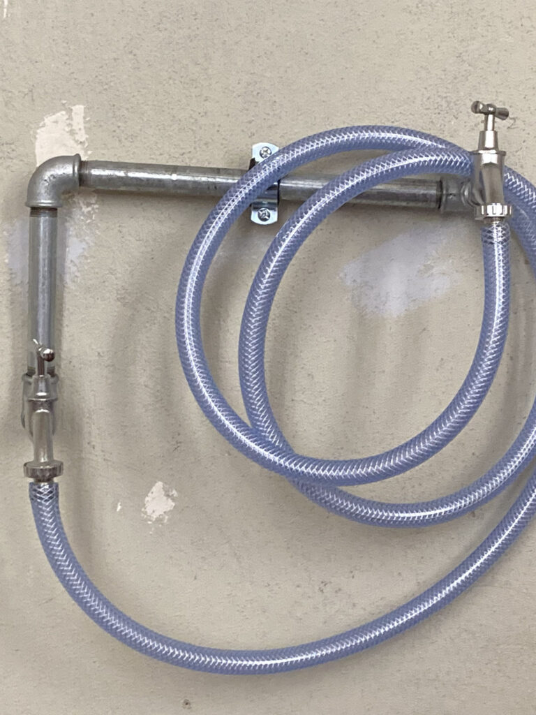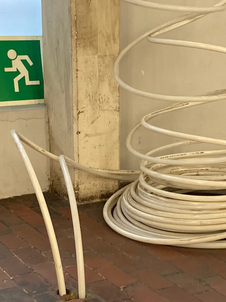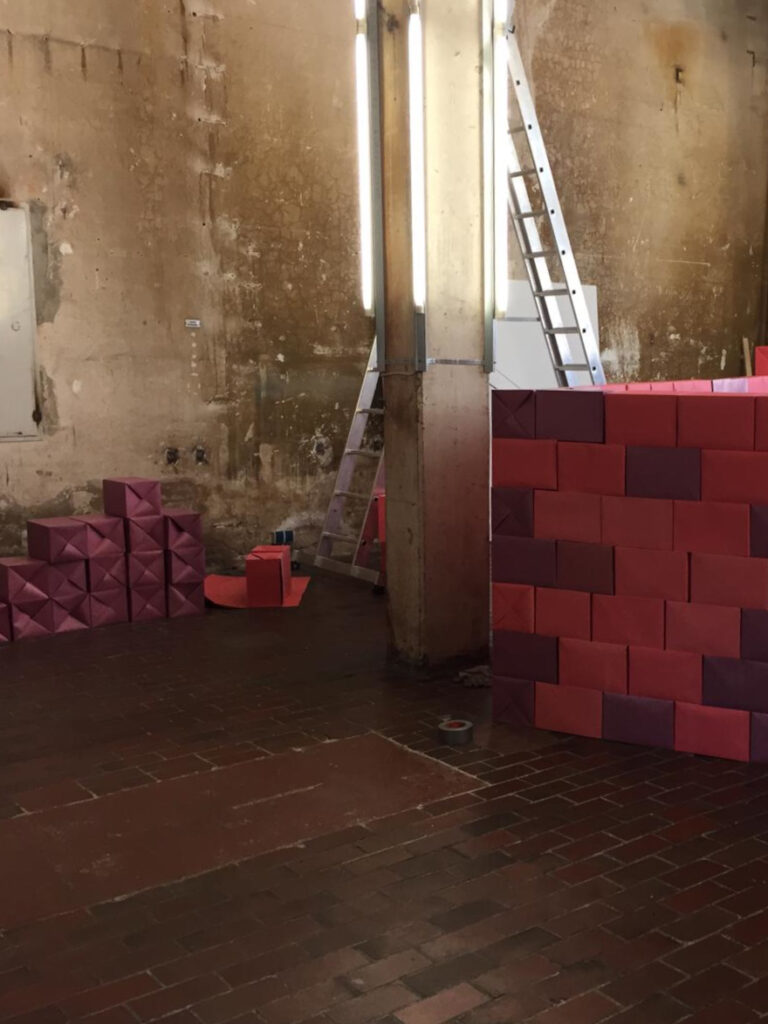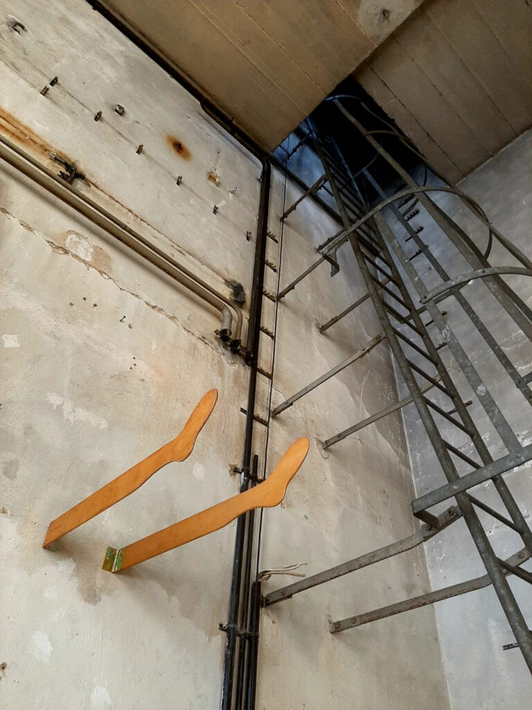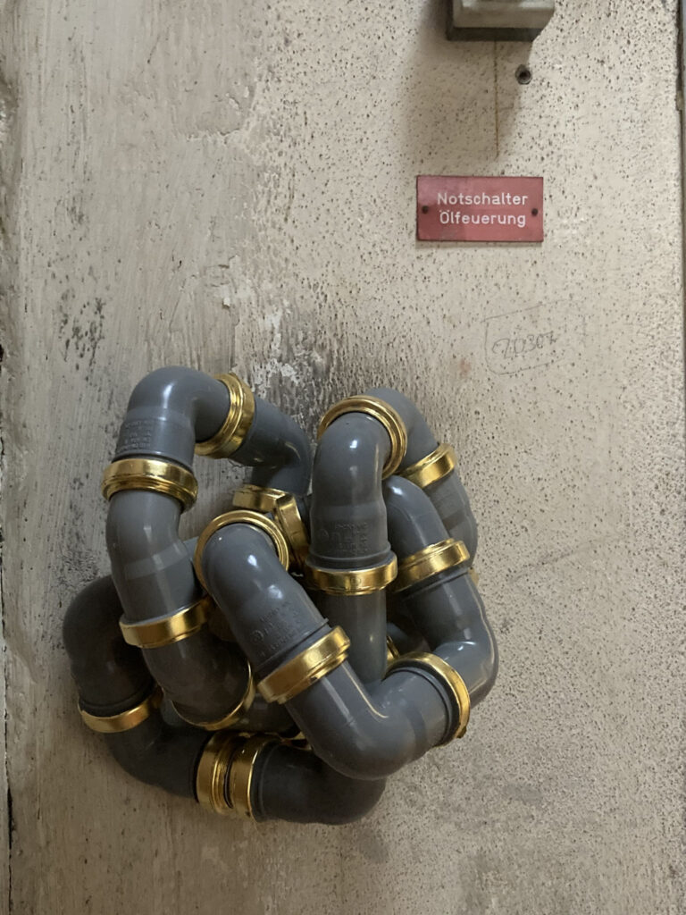 Im ehemaligen Kesselhaus wurde in mit Kohlen befeuerten Kesseln Wasser für die angrenzende Wäscherei erhitzt. Aktuell ist der Raum teilentkernt und dient als Ausstellungsort u.a. für den Kunstverein Bamberg. Früher wurde hier augenscheinlich schwer gearbeitet. Unter dem Titel to do umkreist Annette Voigt in dieser Installation das Thema Arbeit. Der mittlerweile eingedeutschte Begriff verweist auf das Tun, mit to do – Listen soll Unerledigtes effizienter abgearbeitet werden. Arbeit ist ambivalent besetzt, zum einen Mühe, aber auch Identifikationsmöglichkeit und Daseinserfüllung. So fühlen sich Arbeitslose oft nicht zur Gesellschaft zugehörig, weil sie nicht arbeiten. Es stellen sich Fragen nach dem Wert von Arbeit, ihrem Charakter, wie sie sich verändert hat, wie sie in Zukunft aussehen könnte. Überall im Kesselhaus sind Rohrteile, Schächte, Löcher, etc. noch sichtbar. Diesen Rohrresten fügt die Künstlerin neue hinzu, baut weiter mit einer Mauer aus Papiersteinen, lehnt imaginäres Arbeitsgerät an die Wände, zeigt einen Film, in dem sich Menschen die Hände waschen. Die Materialien, mit denen Annette Voigt arbeitet, sind der Alltagswelt entlehnt, erscheinen zunächst ‚kunstfern‘. Daraus konstruiert sie neue Objekte, Geräte, Einbauten – keine ready mades à la Duchamp. Diese verweigern sich einem konkreten arbeitstechnischen Gebrauch, entwickeln vielmehr ein eigenes, bisweilen augenzwinkerndes Spiel, das uns herkömmliche Vorstellungen von Arbeitswelten hinterfragen lässt.